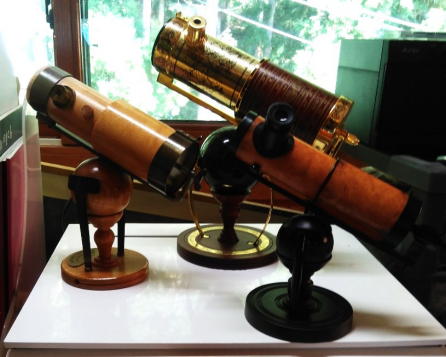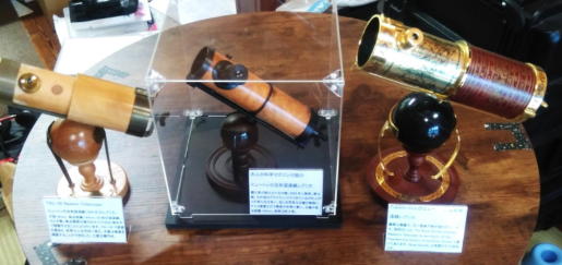 (2)ニュートンの反射望遠鏡レプリカはこれまでの2体(写真の左と中央奥)に学研の大人の科学付録